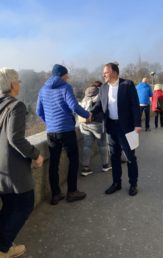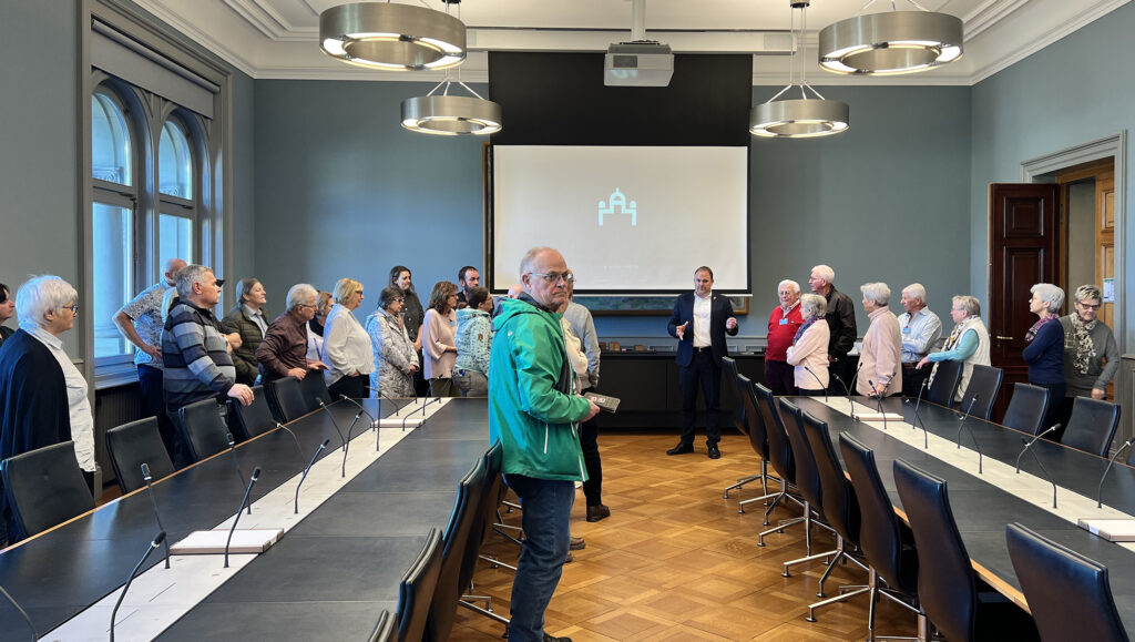 Beim anschliessenden Apéro nahm sich Marcel Dettling Zeit für Gespräche, bevor er zu einer Abstimmung eilte. Danach setzte er die Führung durch das Bundeshaus fort. Im Sitzungszimmer der SVP beantwortete er gemeinsam mit Roman Bürgler Fragen der Teilnehmenden.