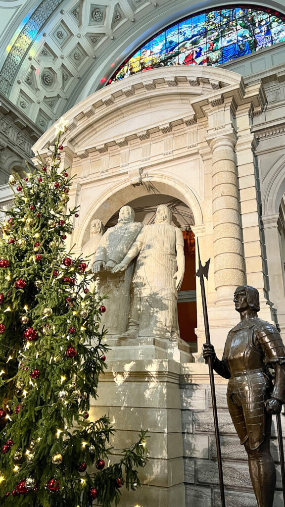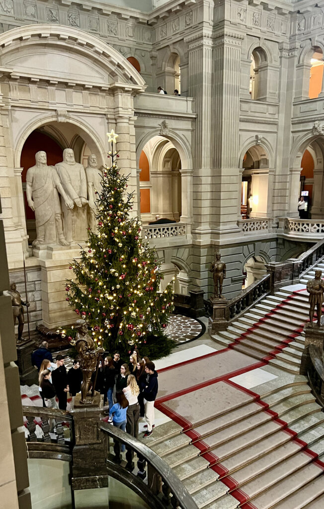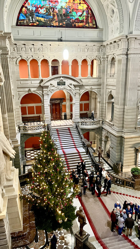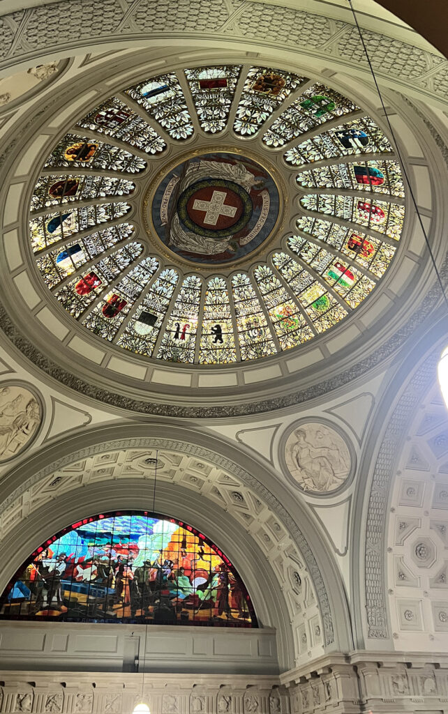 Nach dem Mittagessen blieb Gelegenheit für Fotos und einen Rundgang durch die Eingangshalle. Besonders beeindruckten die Glaskuppel mit den Kantonswappen, das Denkmal der drei Eidgenossen sowie die Darstellungen der Landesknechte der vier Landessprachen.